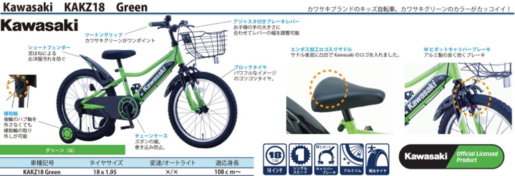 新商品「Kawasaki(カワサキ)」モータースのライセンスキッズモデル、「KAKZ18 Green」 2026年03月8日#新商品のご案内 カワサキグリーンがかっこいい!カワサキモータースのライセンスキッズバイクです。 カワサキグリーンが素敵なキッズサイクルです。 サドルにはKawasakiのロゴが刻印されています。 キッズ車にはめずらしく制動力の高い「Wピボットアルミキャリパーブレーキ&赤色ブレーキシュー」が装備されています。 詳しくは営業担当までお問い合わせください。