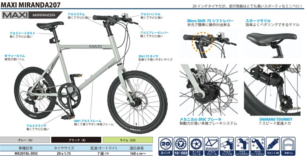 新商品「MAXI MIRANDA207」DISCブレーキ装備の軽量アルミフレーム!20インチ小径自転車。 2026年03月1日#新商品のご案内 街の中を颯爽と走れる20インチのミニベロです。軽量6060アルミフレーム・前後ディスクブレーキ・SHIMANO外装7スピードが装備! 詳しくは営業担当までお問い合わせください。