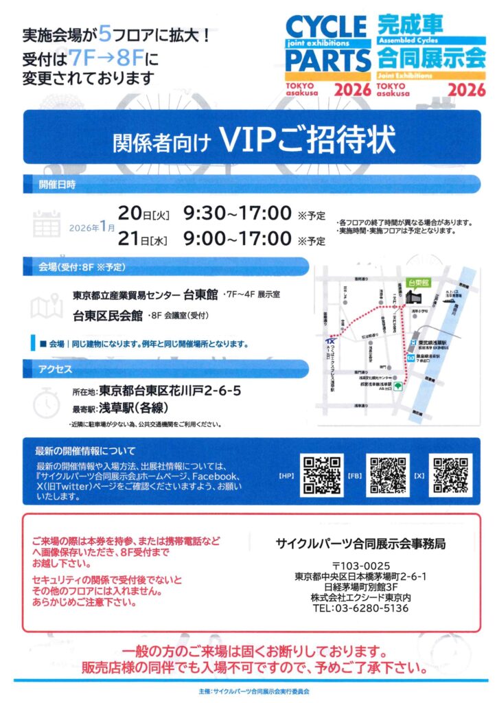 2026年1月20日~21日 「サイクルパーツ&完成車合同展示会」にサカイサイクルも出展いたします。