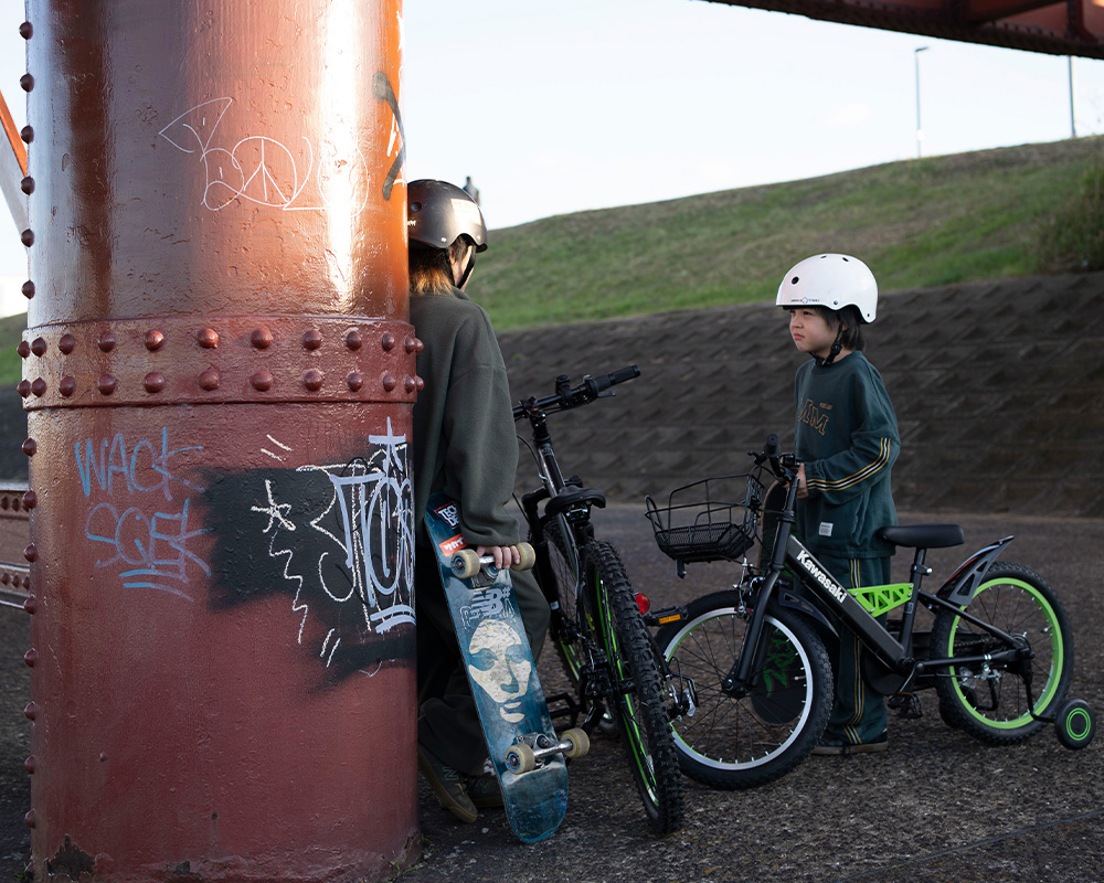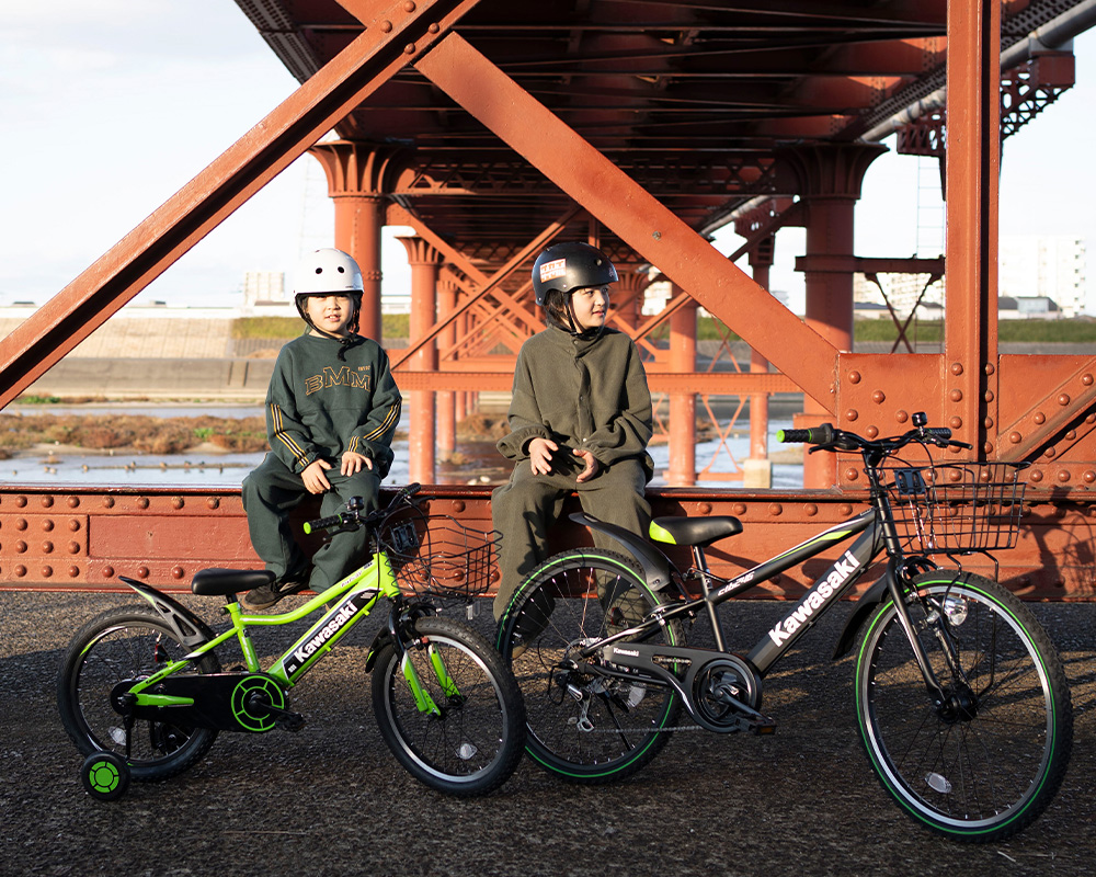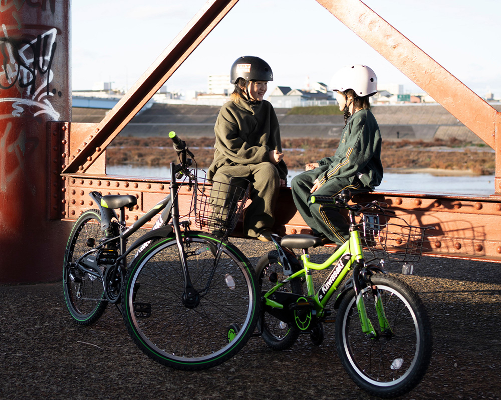 小学生プロスケートボーダー河上エマ選手と弟さんをモデルに、サカイサイクル本社近くの「大和川沿い」で新商品のKawasakiライセンス自転車の撮影会を行いました。